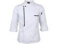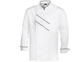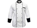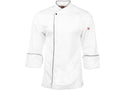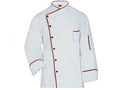Executive white Chef Jackets with white piping and different designs and fabrics.
